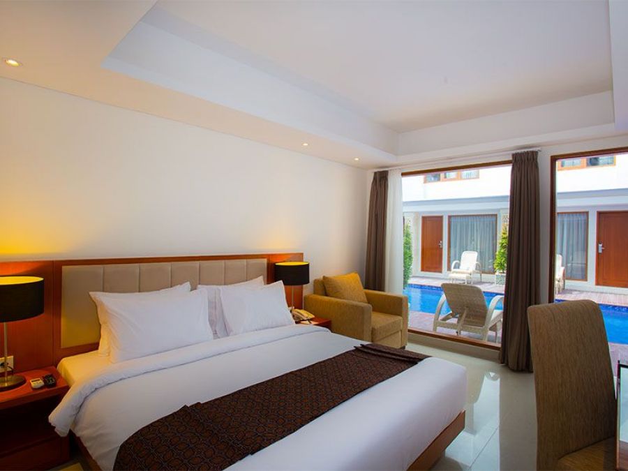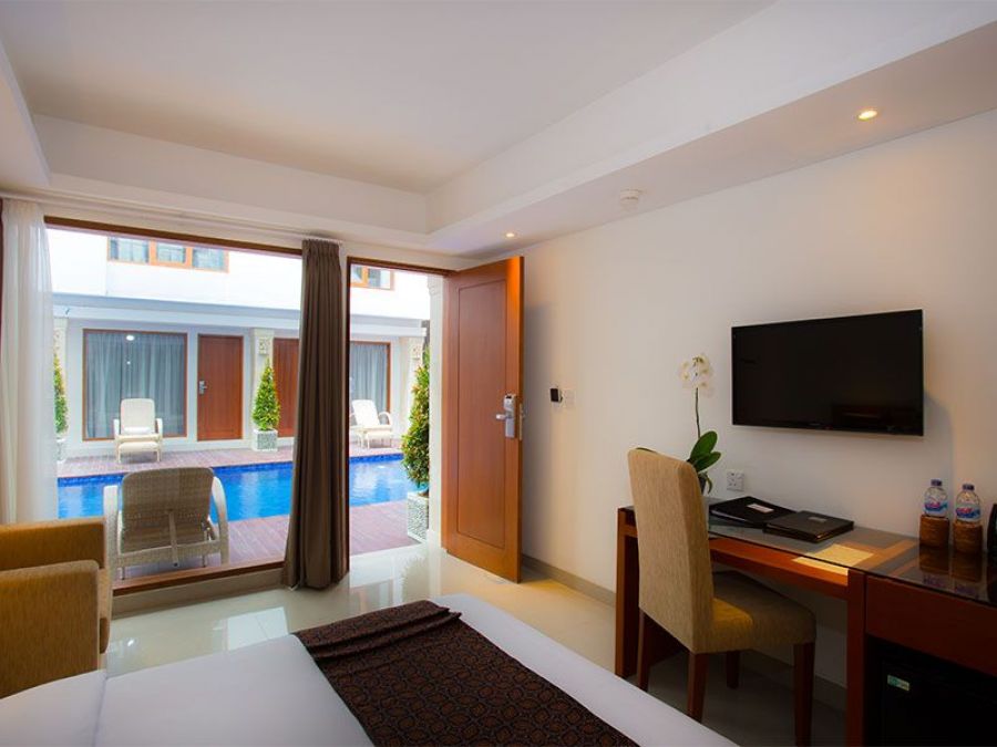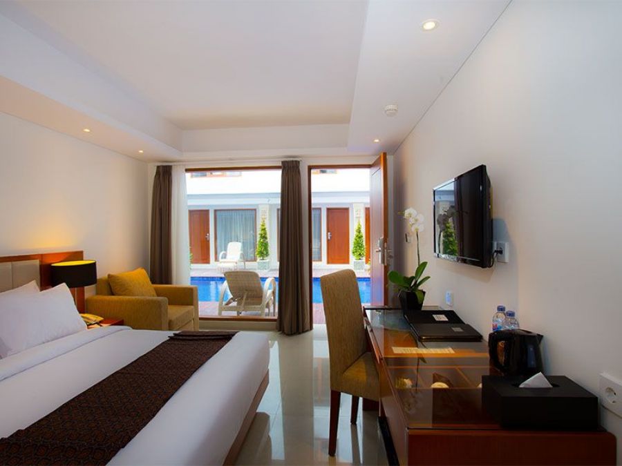 Located on the first floor, our 30 sqm Deluxe Pool Access Room features a private outside terrace with comfy chair and coffee table, set by the swimming pool. Step out and have a private tea-time towards the pool.